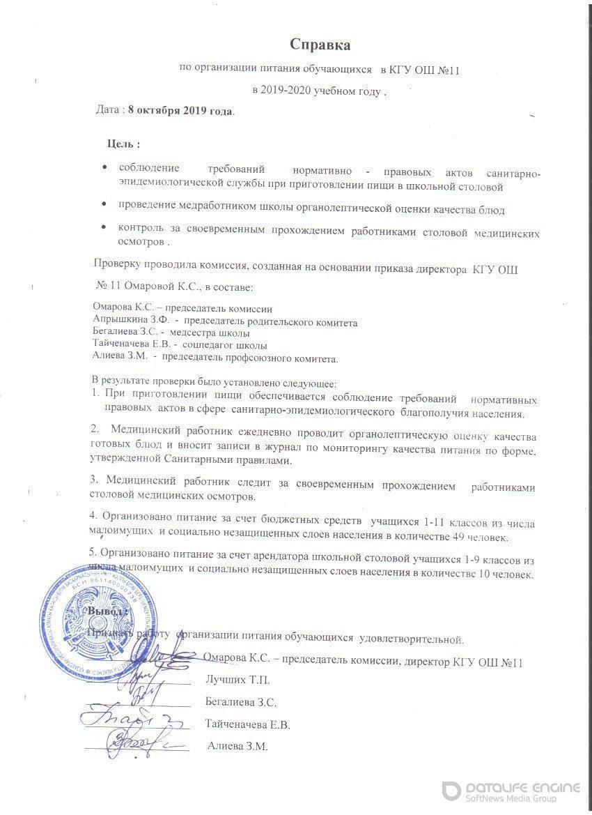 Тамақтануды ұйымдастыру туралы анықтама Справка об организации питания
