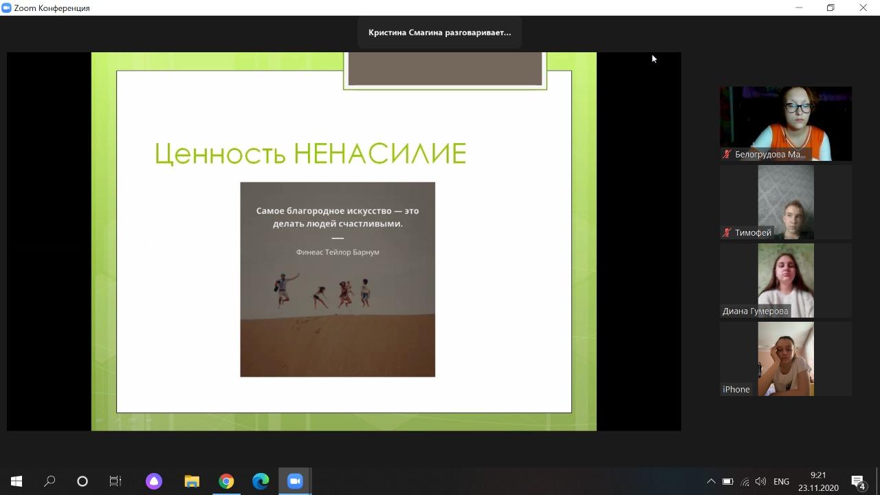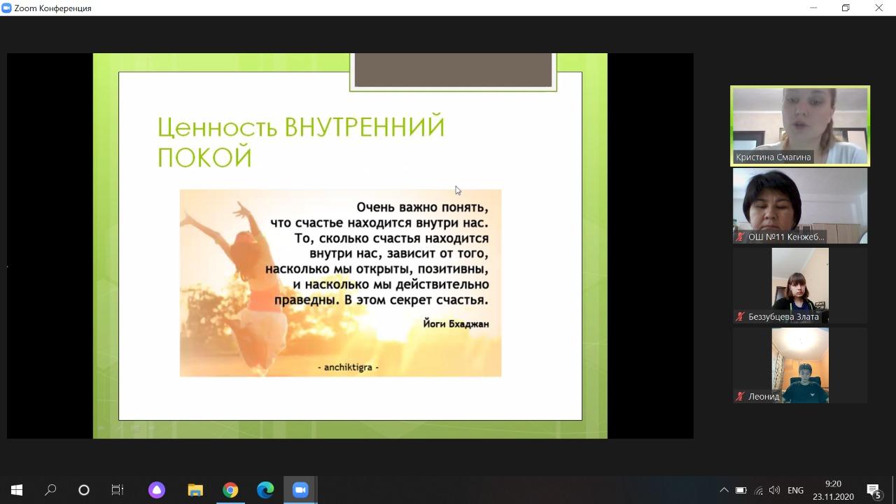 В рамках проведения недели, посвященной ежегодному Дню общечеловеческих ценностей 23 ноября 2020 года классными руководителями и учителями самопознания КГУ ОШ 11 проведён Республиканский единый урок на тему:,, Общечеловеческие ценности - основа счастливой жизни ".