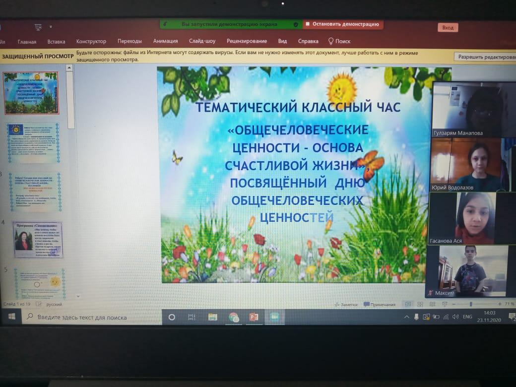 23 қараша – Адами құндылықтар күні қазақстандық мұғалімдердің, балалар мен олардың ата-аналарының мектеп өмірінде дәстүрге айналды. Бұл күні «Жалпы адамзаттық құндылықтар – бақытты өмірдің негізі» атты республикалық бірыңғай сабақ өтіп, онда ақиқат, сүйіспеншілік, әділ мінез-құлық, ішкі тыныштық және зорлық-зомбылық жасамау туралы мәңгілік құндылықтар туралы әңгіме қозғалады.23 ноября – День общечеловеческих ценностей - вошел традицией в школьную жизнь казахстанских педагогов, детей и их родителей. В этот день проводится Республиканский единый урок «Общечеловеческие ценности – основа счастливой жизни», на котором разговор идет о вечных ценностях, это - Истина, Любовь, Праведное поведение, Внутренний покой и Ненасилие.