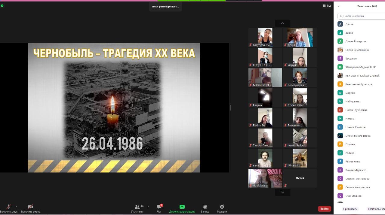 Биыл адамзат тарихындағы Чернобыль атом электр станциясындағы ең үлкен апатқа 35 жыл толды. Чернобыль апаты миллиондаған адамдардың тағдырына әсер етті. Ядролық апаттың 35 жылдығы аясында бүгін "Чернобыль - трагедия ,виг, ескерту" атты бірыңғай сынып сағаты өткізілді, онда деректі фильмдерден үзінділер, бейнероликтер мен тұсаукесерлер көрсетілді.