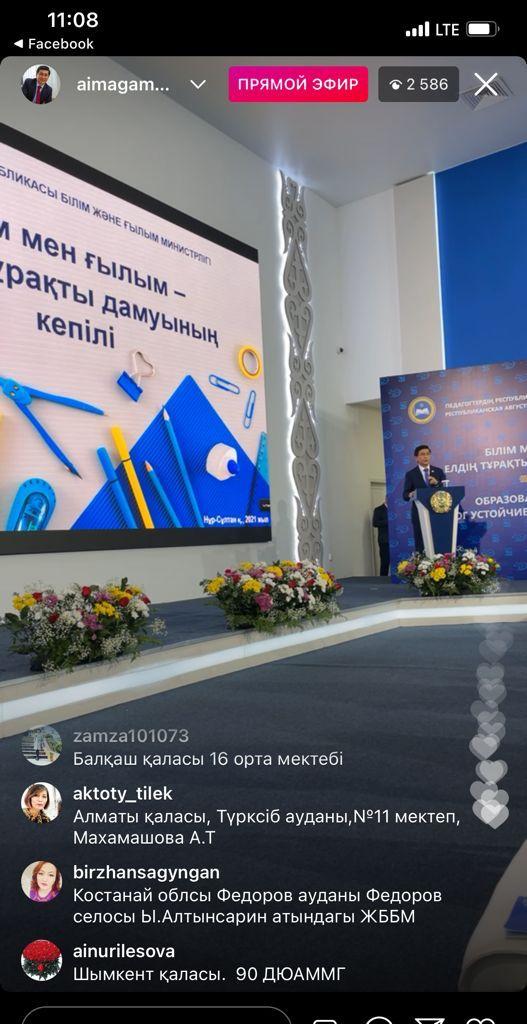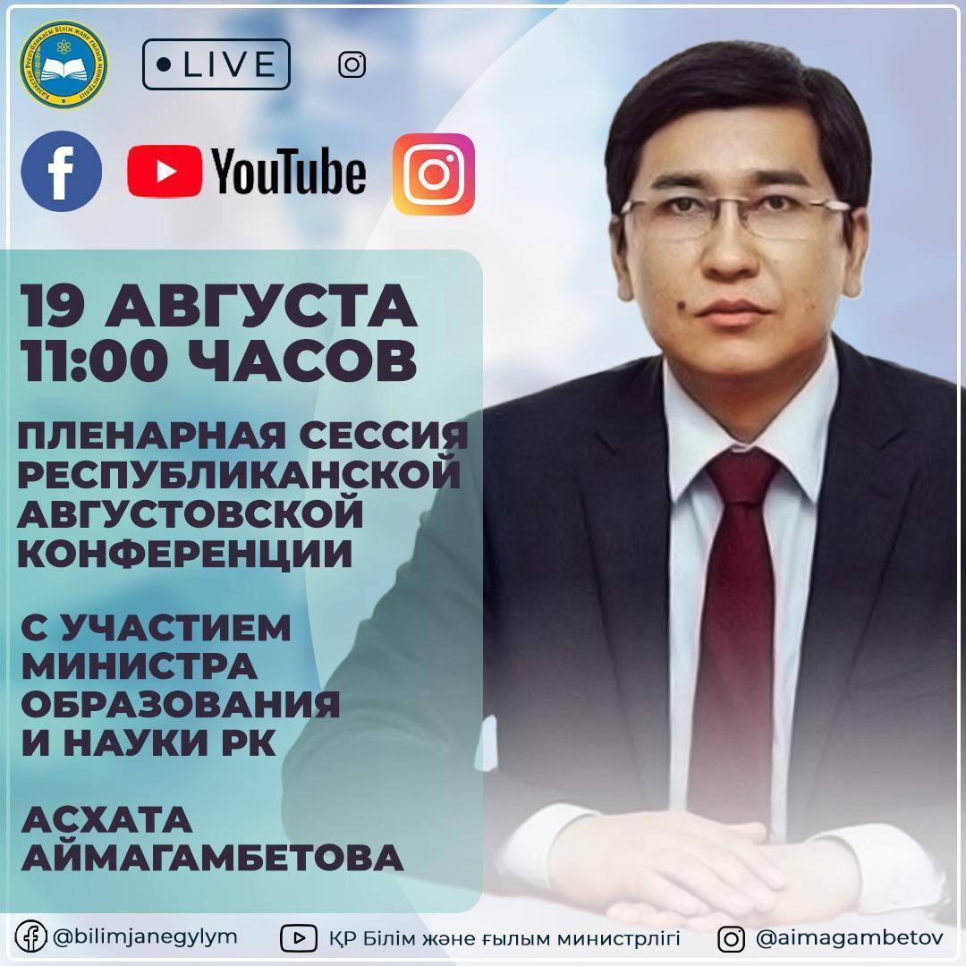 19 тамызда Педагогтердің "Білім және ғылым – елдің тұрақты дамуының кепілі" республикалық тамыз конференциясының пленарлық сессиясы өтті. Іс-шараға ҚР Білім және ғылым министрі Асхат Аймағамбетов, Қазақстан Республикасындағы Бала құқықтары жөніндегі уәкіл Аружан Саин, ЭЫДҰ Білім және дағдылар департаментінің басшысы Андреас Шляйхер және білім беру саласының басқа да өкілдері қатысты.Instagram-да Білім және ғылым министрінің парақшасында Педагогтердің республикалық тамыз конференциясының пленарлық сессиясы онлайн режимінде ҚР БҒМ-нің Facebook-тегі ресми парақшасында және ведомствоның YouTube-каналында көрсетілді.