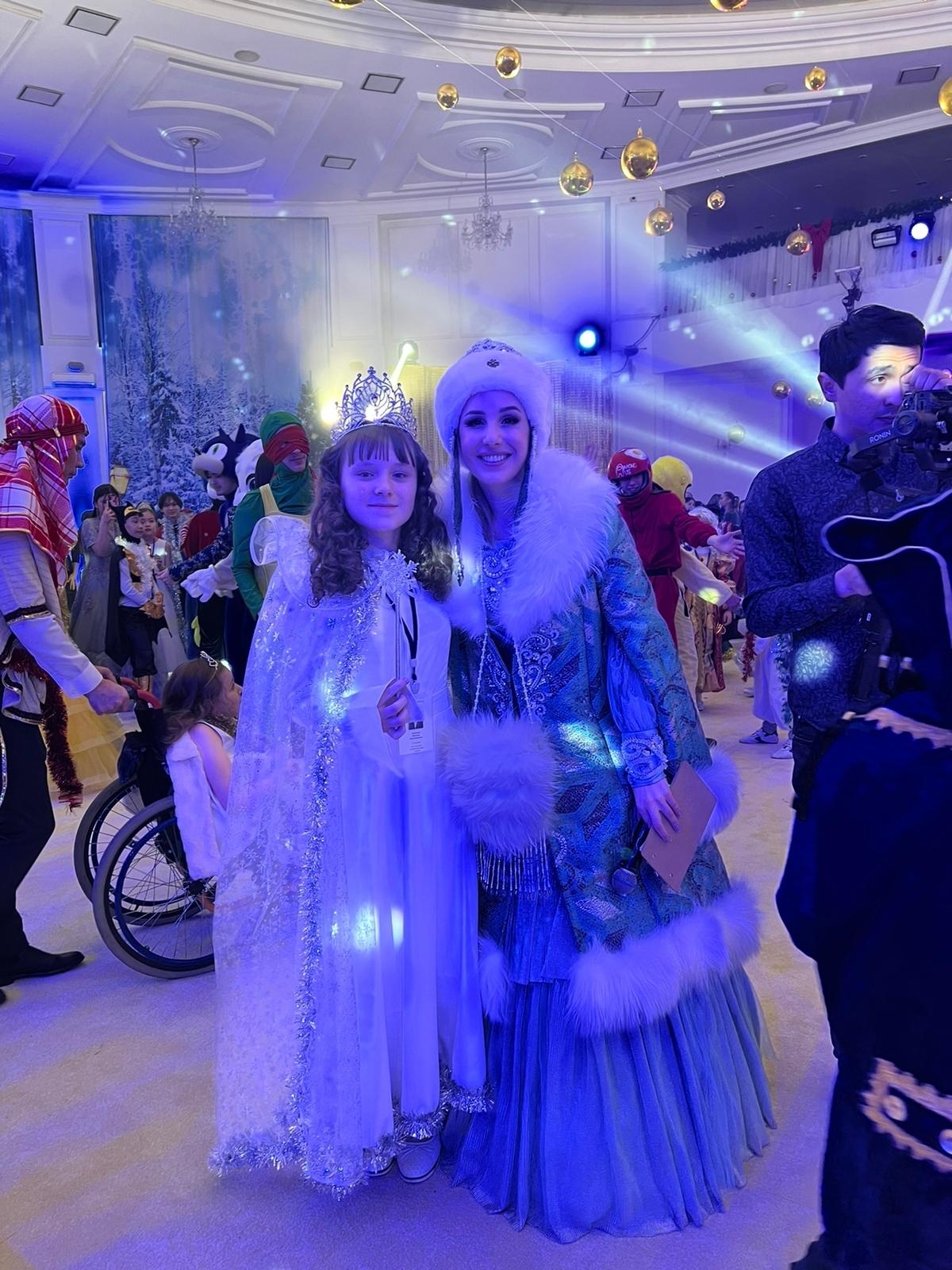 7 " А " сынып оқушысы Абрамова Надежда Аяз Ата және Ақшақармен / Ученица 7 " А " класса Абрамова Надежда с Дедом Морозом и Снегурочкой