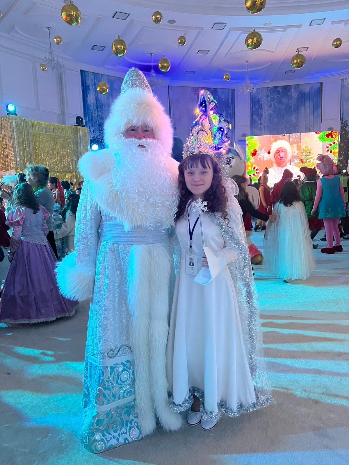 Школа №11 г. Алматы » Ақпарат » 7 " А " сынып оқушысы Абрамова Надежда Аяз Ата және Ақшақармен / Ученица 7 " А " класса Абрамова Надежда с Дедом Морозом и Снегурочкой