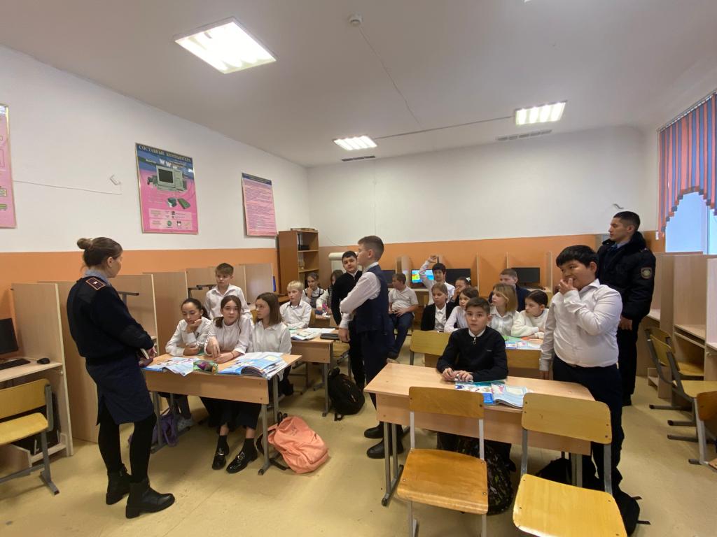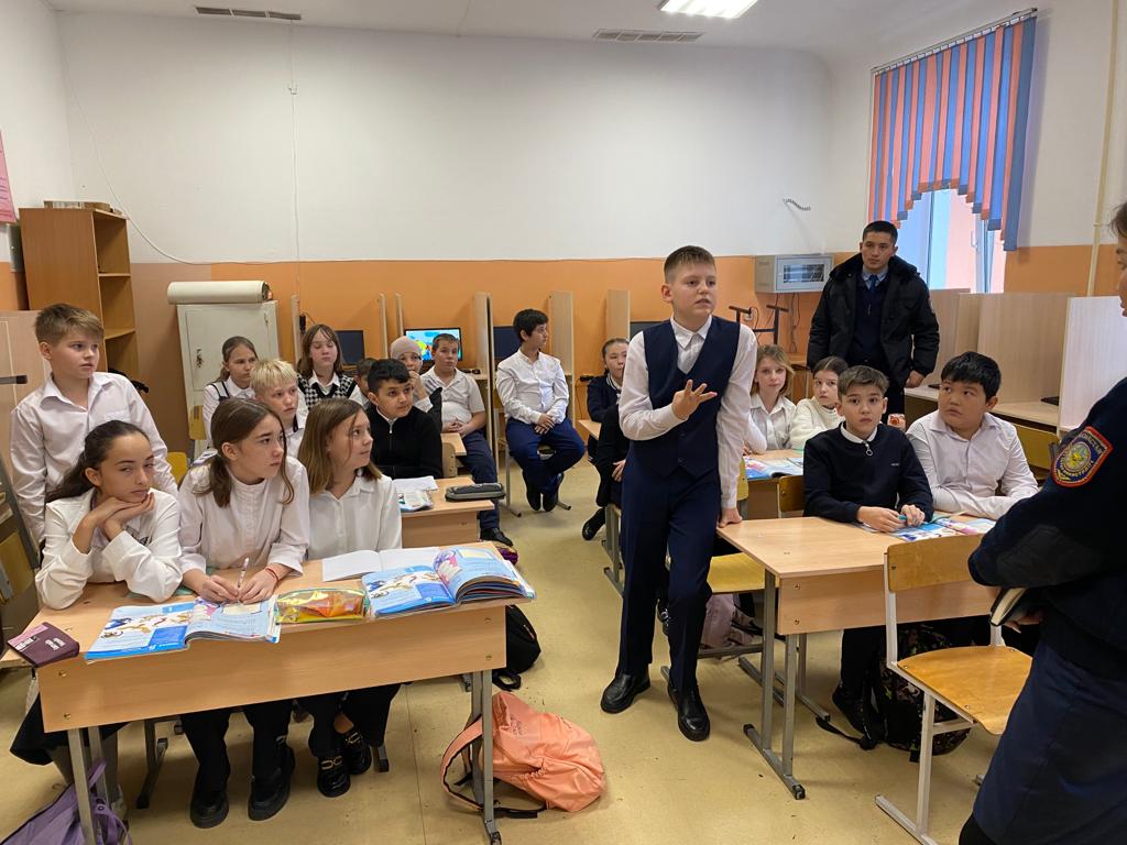 Бүгін мектебімізде 5-сыныптар арасында учаскелік инспекторлармен құқықбұзушылық тақырыптарына әңгіме жүргізілді. Сегодня в учащимися 5-х классаов участковыми инспекторами