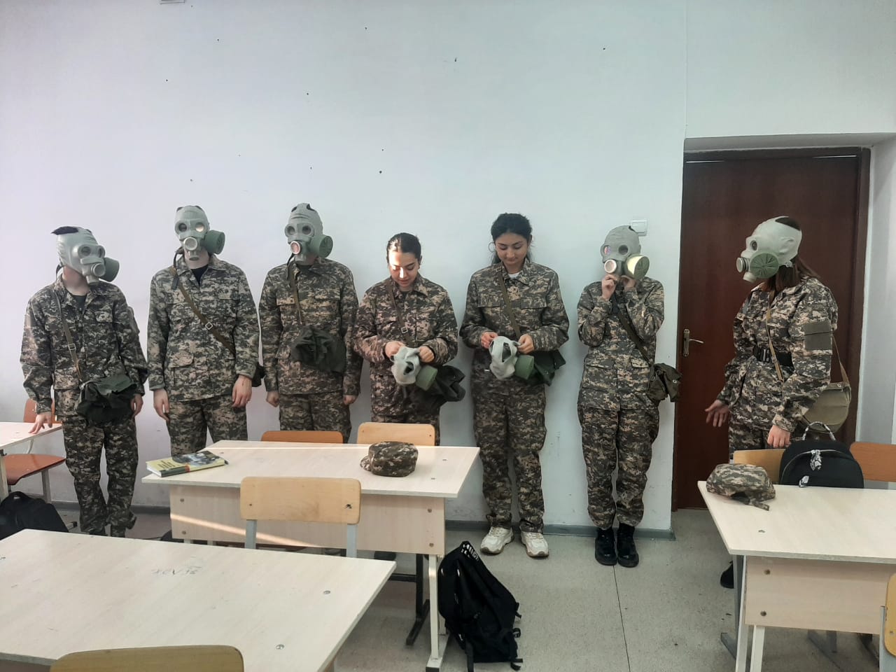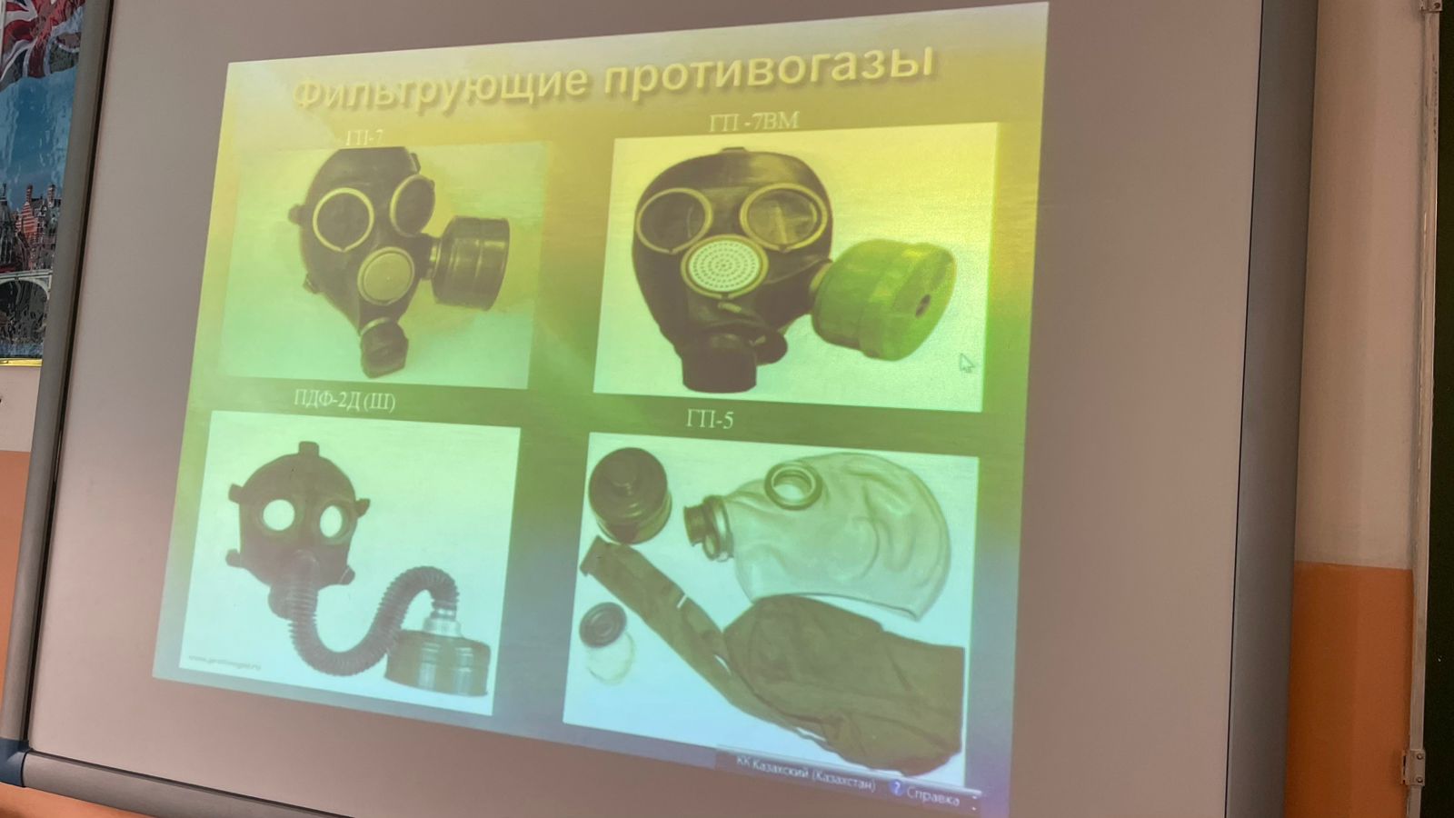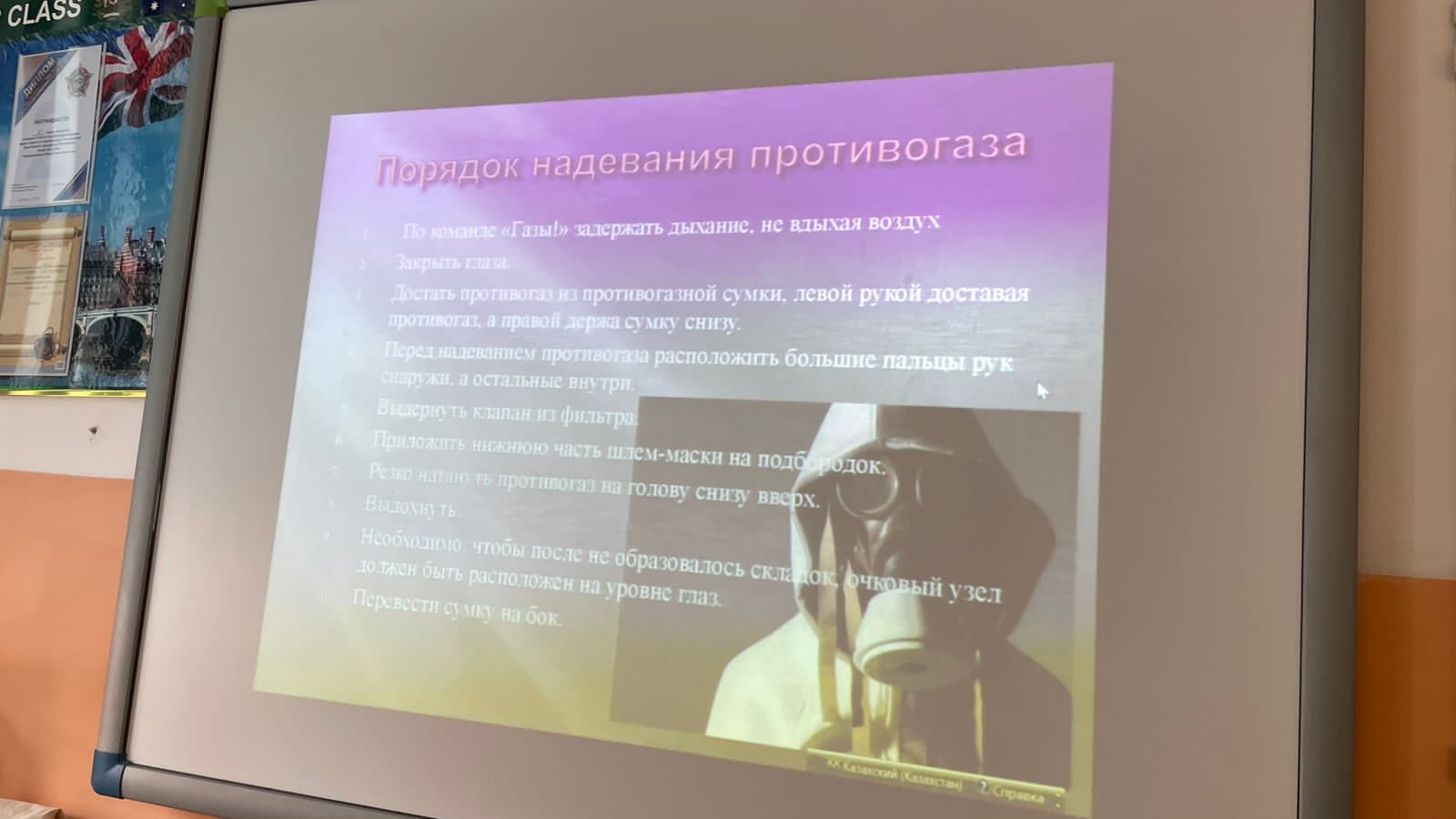 10 “А” сыныбында АӘД сабағында оқушыларға противогаз кию тәртібін түсіндіру жұмыстары жүргізілді. Алдымен противогазды қалай кию керектігін түсіндіру бойынша презентация көрсетілді, содан кейін оқушылар келесі нұсқаулар бойынша противогаз киюге жаттықты.