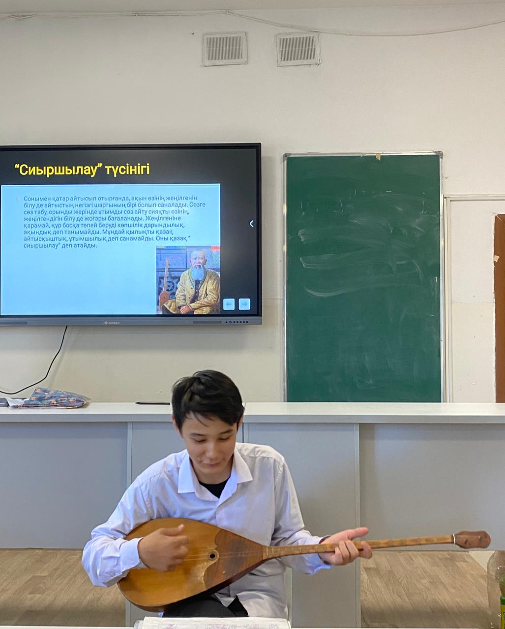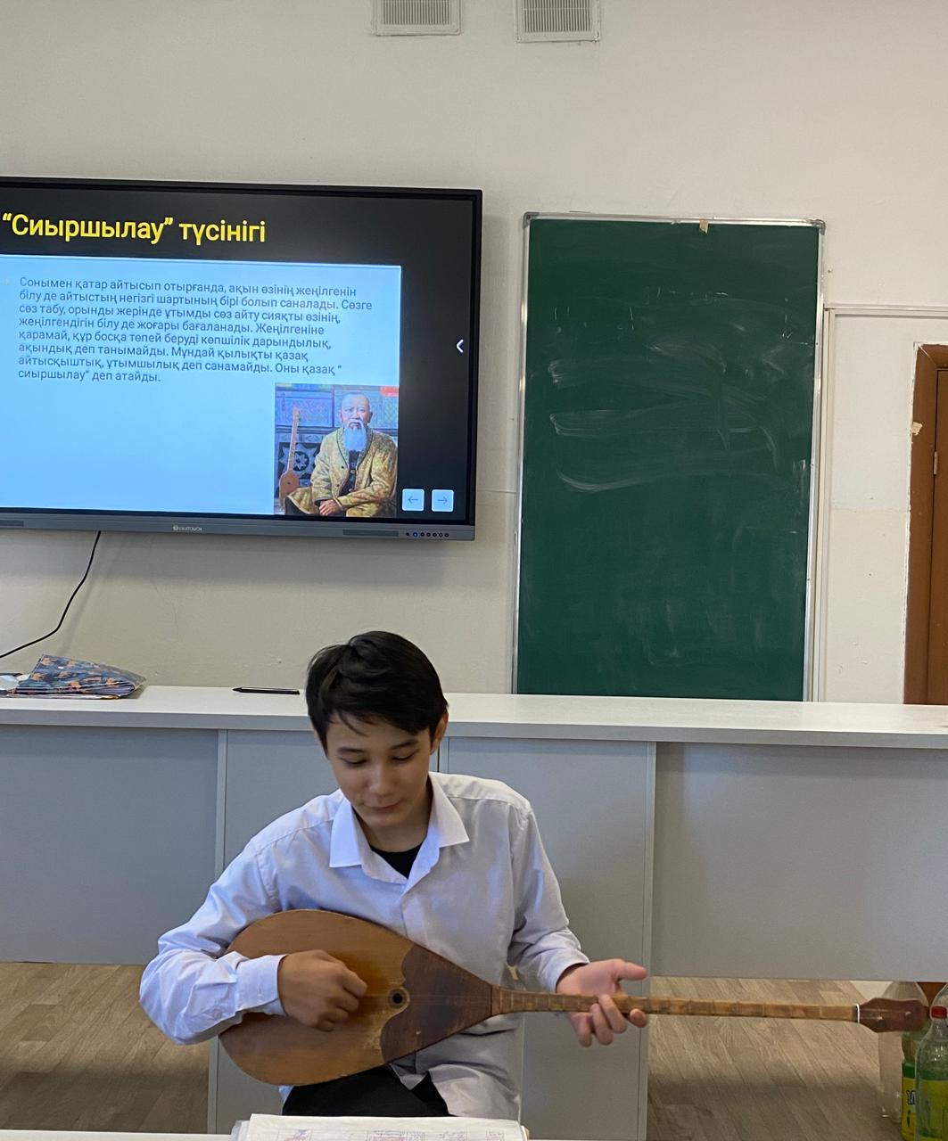 Мектебімізде, қазақтың ұлттық өнері, айтыспен оқушыларды таныстыру мақсатында «Айтыс-асқақ өнер» тақырыбында ашық сабақтар өтті. / В нашей школе, в целях ознакомления учащихся с казахским национальным искусством, айтыс, прошли открытые уроки