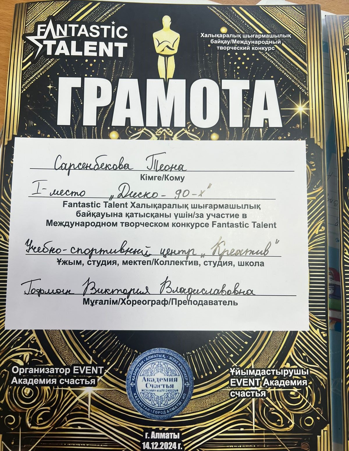 19 желтоқсан 2024 0 1 2 3 4 5 Біздің жетістіктеріміз / Наши достижения "Международный конкурс танца"1 "А" классБаева ОльгаСарсенбекова ТеонаКлассный руководитель: Дадишева Ю.А. Осы беттің QR-коды:QR-код этой страницы: