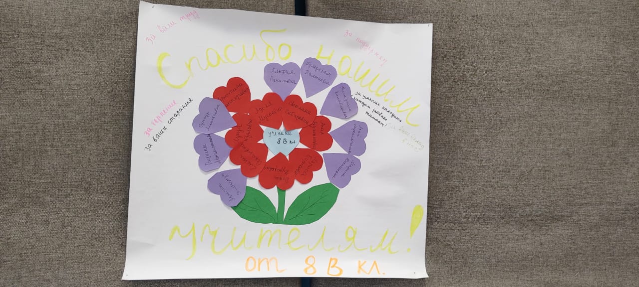 8 «В» сынып оқушылары Алғыс айту күніне орай өз ұстаздарына шынайы ризашылықтарын білдірді. Бұл ерекше күні олар ұстаздарына жүрекжарды тілектерін айтып, еңбектері мен қамқорлықтары үшін алғыс айтты. Ұстаз – тек білім беруші ғана емес, сонымен қатар оқушылардың болашағына жол көрсететін мейірімді жан.