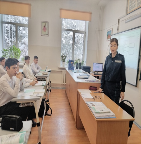 В КГУ ОШ №11 09 января 2025 года сотрудником отделения УИП капитан полиции Искандеров Тимур Шамхалвич совместно Ст.УИП ОЮП майор полиции Джолдасбековой Салтанат Бекеновной проведена профилактическая лекция с учащимися 4-8 классов на тему «Разрешено законом» (о правилах несовершеннолетних на улицах в общественных местах в быту)