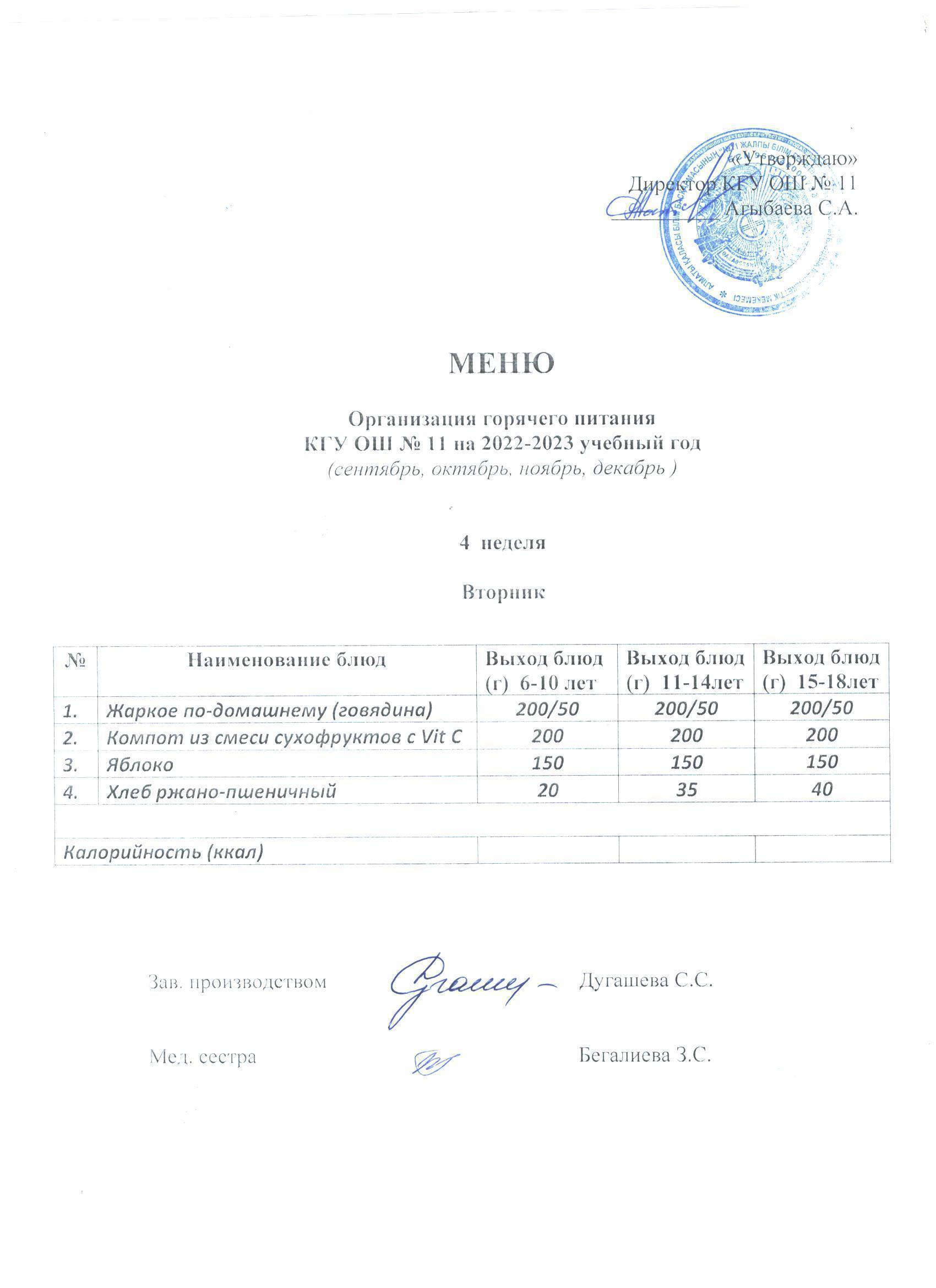 2020 жылға арналған Мектептегі тамақтану мәзірі Меню по школьному питанию на 2020