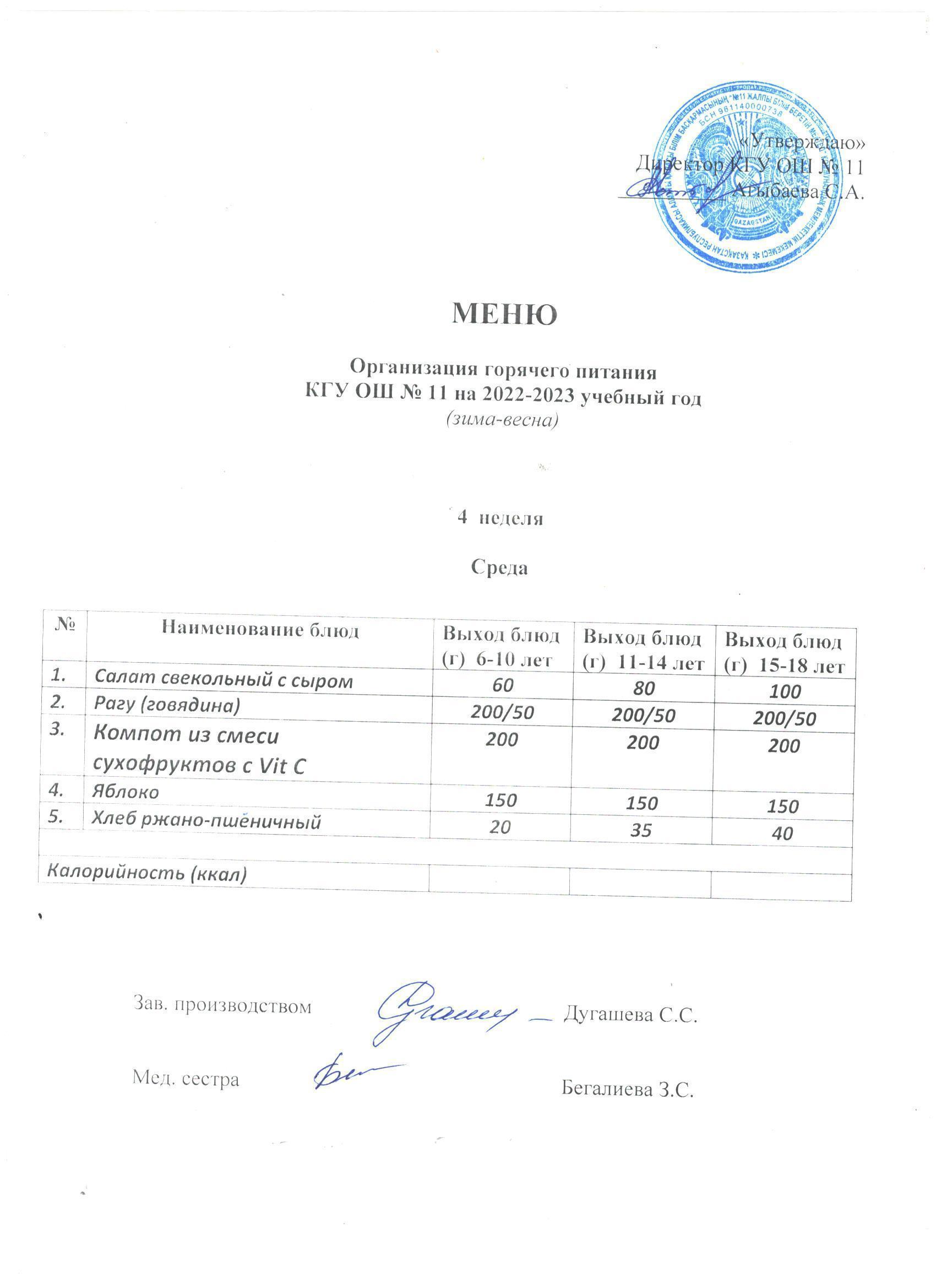 Мәзір (қыс-көктем) Меню (зима-весна)