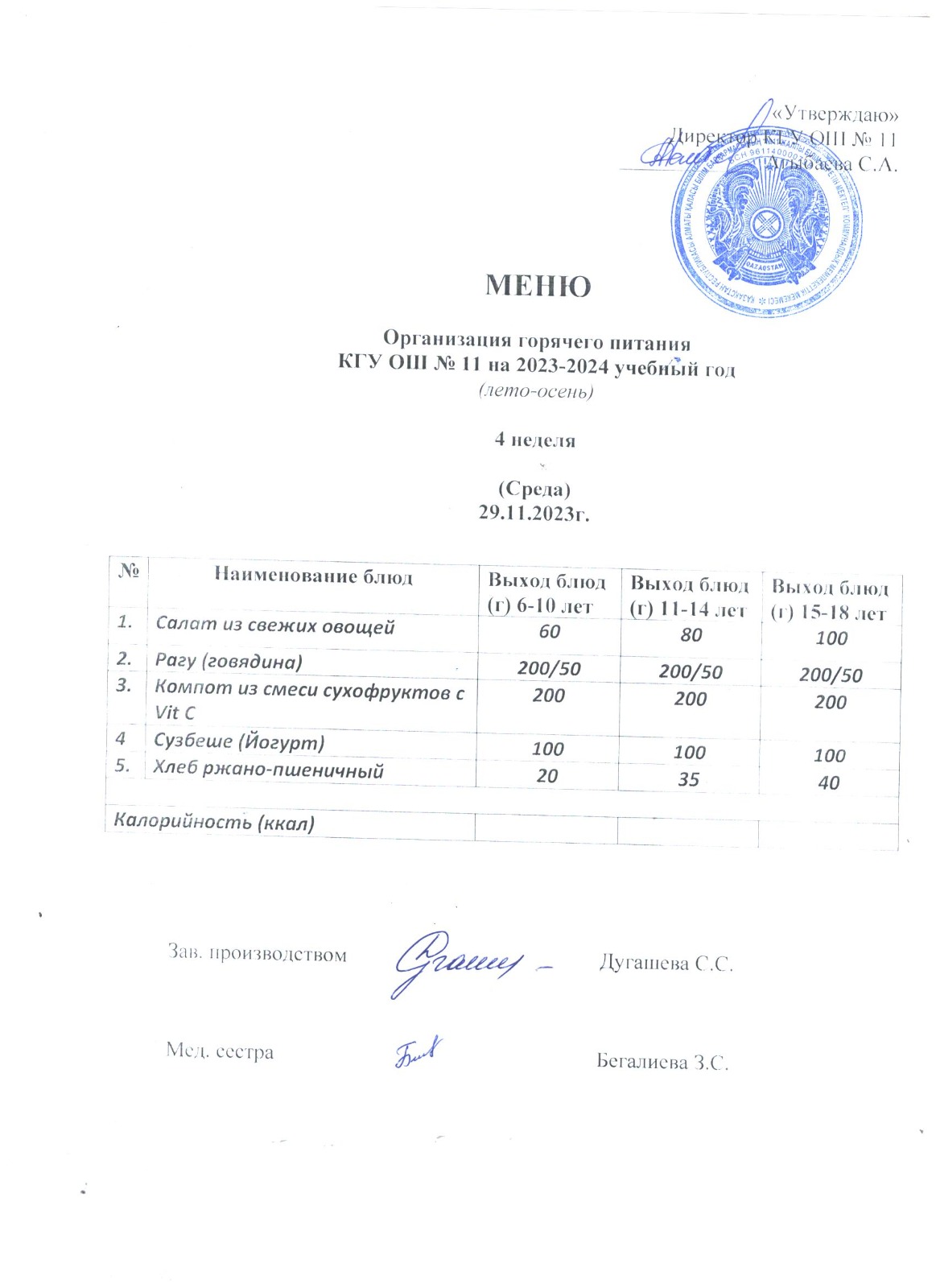 Мәзір (қыс-көктем) Меню (зима-весна)