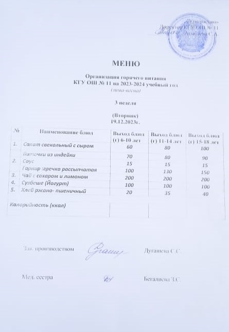 Мәзір (қыс-көктем) Меню (зима-весна)