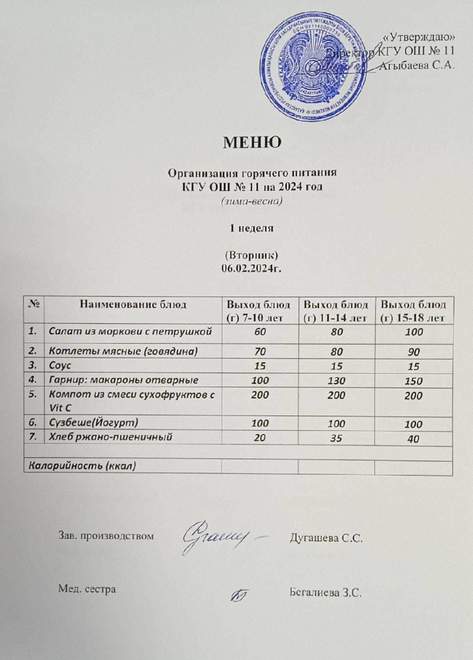 Мәзір (қыс-көктем) Меню (зима-весна)