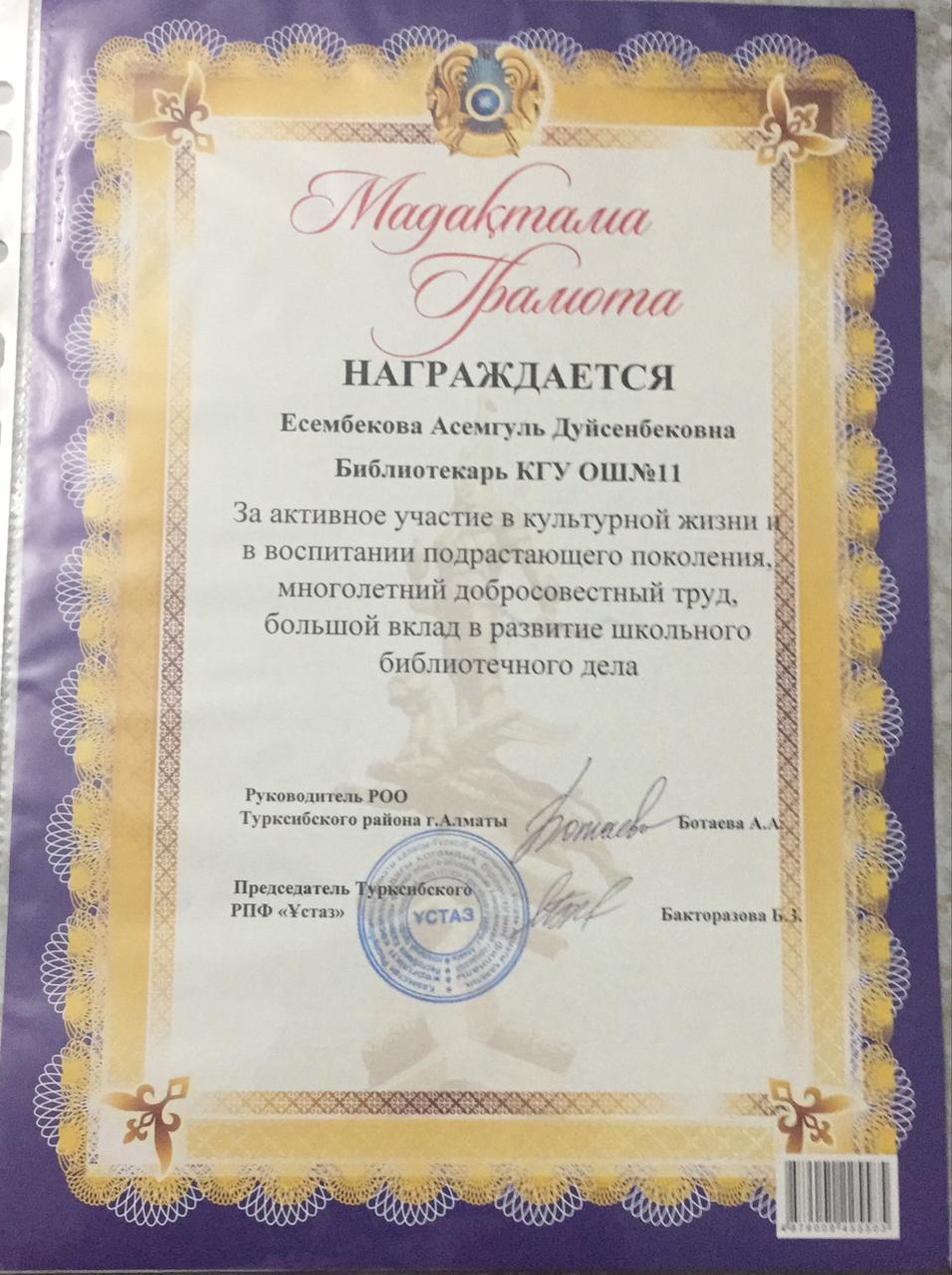 Кітапханашы Есембекова Әсемгүл Дүйсенбекқызына мәдени өмірге және өскелең ұрпақты тәрбиелеуге белсене қатысқаны, көп жылғы адал еңбегі, мектеп кітапханасының дамуына қосқан зор үлесі үшін Алғыс хатпен марапатталады.Библиотеарь Есембекова Асемгуль Дуйсенбековна за активное участие в культурной жизни и в воспитании подрастающего поколения, многолетний добросовестный труд, большой вклад в развитие школьного библиотечного дела. 👏🏻👏🏻👏🏻💐💐💐