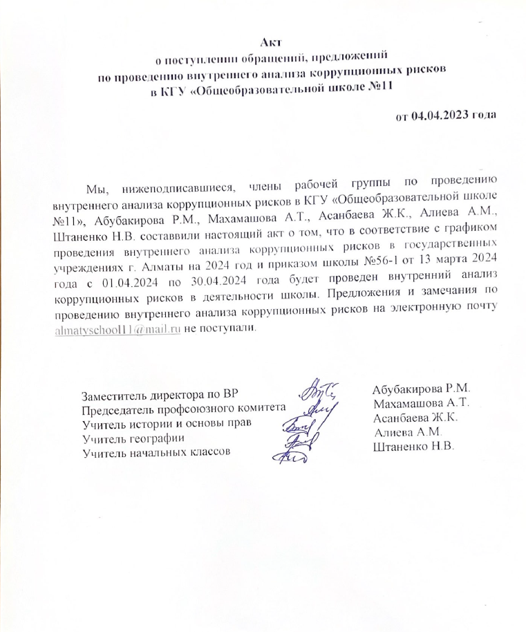 Акт о поступлении обращений, предложений по проведению внутреннего анализа коррупционных рисков в КГУ «Общеобразовательной школе №11 от 04.04.2023 года