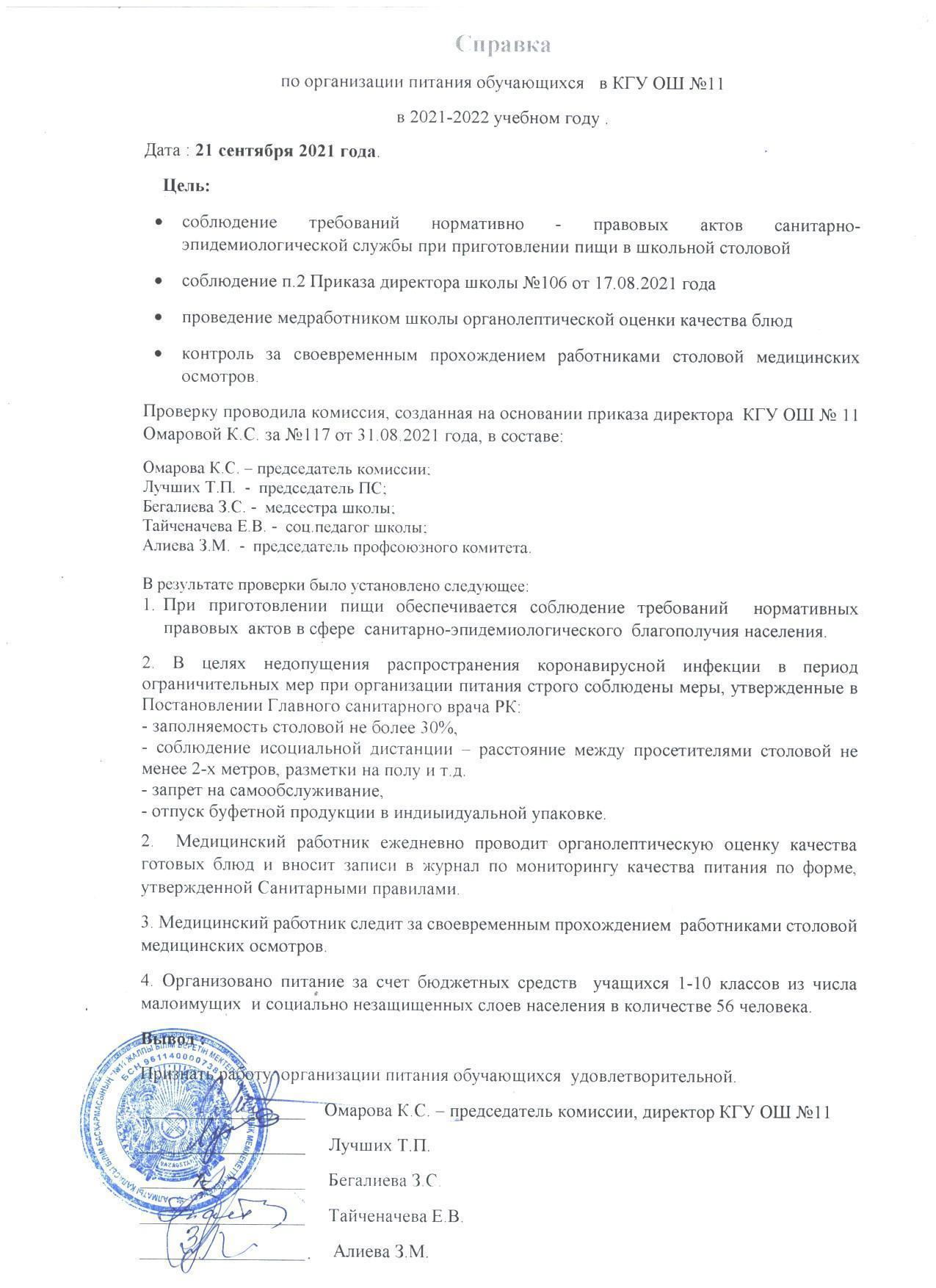 Тамақтануды ұйымдастыру туралы анықтама Справка об организации питания