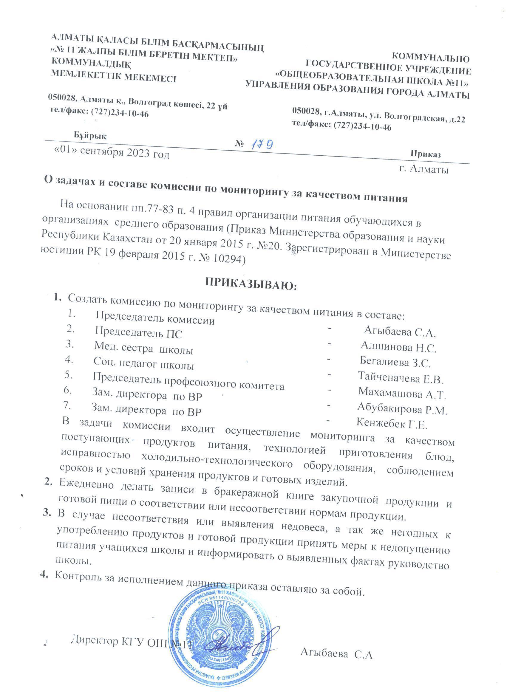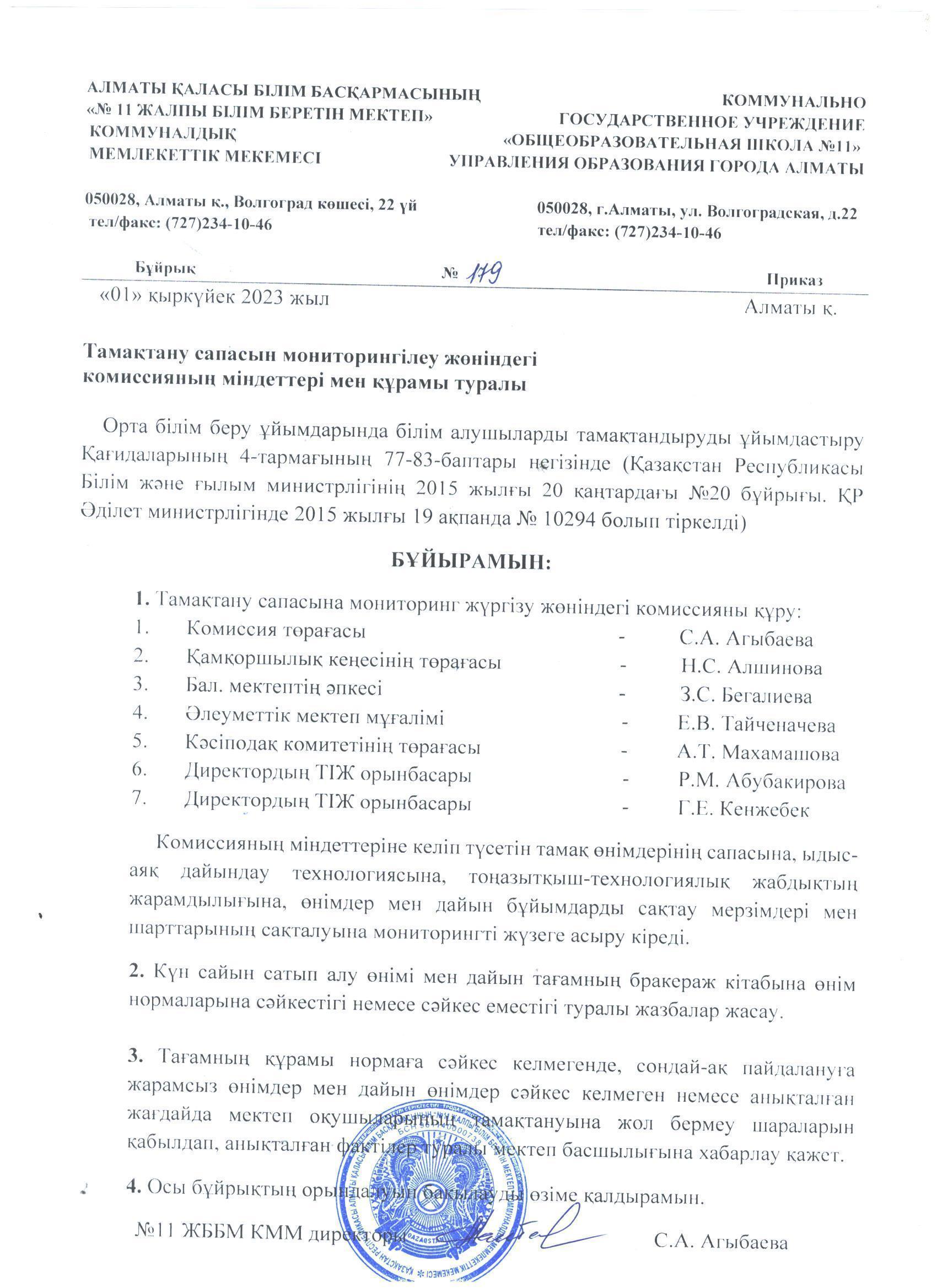 Школа №11 г. Алматы » Тамақтандыру » Тамақ өнімдерінің сапасын бақылау жөніндегі комиссияның міндеттері мен құрамы туралы бұйрық/Приказ о задачах и составе комиссии по мониторингу за качеством питания