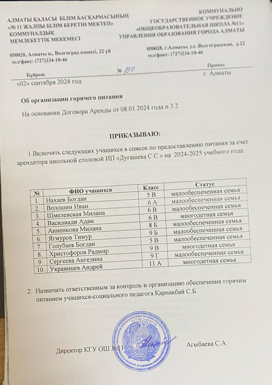 » » » Тамақтануды ұйымдастыру туралы бұйрық/Приказ об организации питания